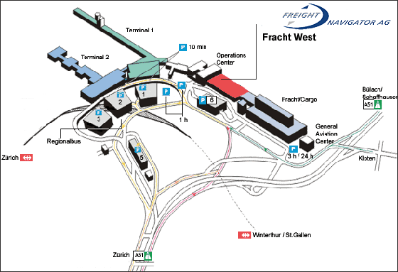 - Autobahn A51 Richtung Bülach/Schaffhausen bei Ausfahrt „Flughafen“ Autobahn verlassen, auf der Spur ganz rechts bleiben, rechts abbiegen.